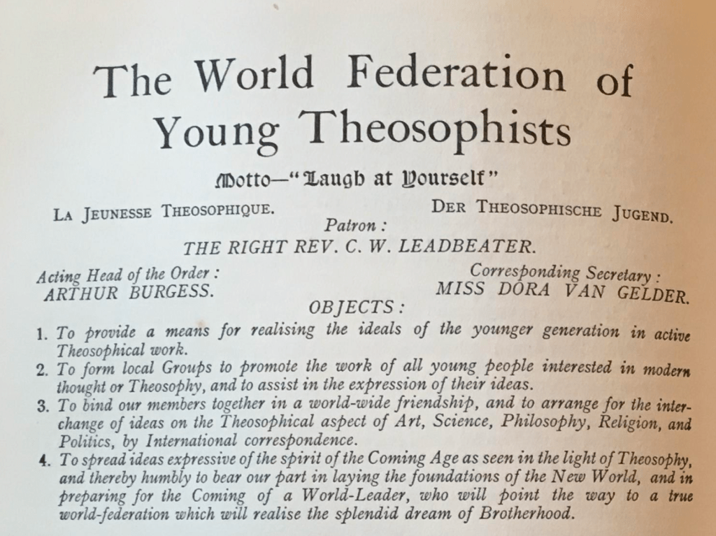 The motto of the WFYT established originally is “Laugh at Yourself“. This alone can give a good idea of the core essence that was infused among the movement of young theosophists. Moreover, four objects were stated to guide its work (read below).